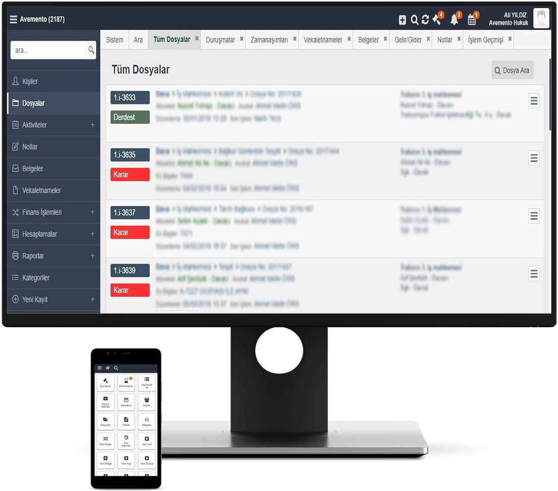 Dosyalarınıza taraf, not, belge, zamanaşımı, masraf vs. ekleyerek her yerden takip edin.
